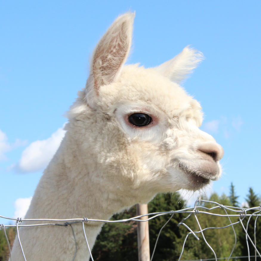 Haanpään kesäkahvilassa voit tavata alempana kuvassa olevan Banskun ja muita alpakoita. Kannattaa käydä tutustumassa.